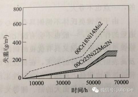 图1.在尿素条件下长期实验的00Cr18Ni14Mo2和00Cr25Ni22Mo2N腐蚀性的比较