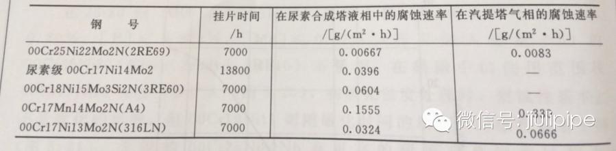表2列出了尿素及316L(316UG)和00Cr25Ni22Mo2N再国内大型尿素生产厂实际挂片试验结果。可以看出,在尿素合成塔和汽提塔中,00Cr25Ni22Mo2N的耐蚀性是最好的。而无镍的铬锰氮不锈钢0Cr17Mn14Mo2N(A4)的耐蚀性则是最差的。(转自不锈钢概论)