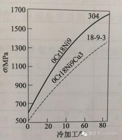 1Cr18Ni2和0Cr18Ni9Cu3,前者是通过提高1Cr18Ni9钢的镍含量,使奥氏体更加稳定,经较大冷变形后,可基本上不产生马氏体相变,既可使钢的冷加工硬化倾向小,更易于冷加工成型,减少中间退火次数。同时,由于固溶态与轧态的透磁率变化很小(图4),较0Cr18Ni9(304)更适于无磁用途。而0Cr18Ni9Cu3则系加入铜使奥氏体更加稳定,冷加工过程转变为马氏体的敏感性降低,从而使钢的冷作硬化倾向和冷作速率以及冷开裂敏感性下降,使此钢在较小变形力作用下可获得最大的冷变形,因此,0Cr18Ni9Cu3更适于紧固件和深冲、深拉等用途。图5和图6系一些试验结果。