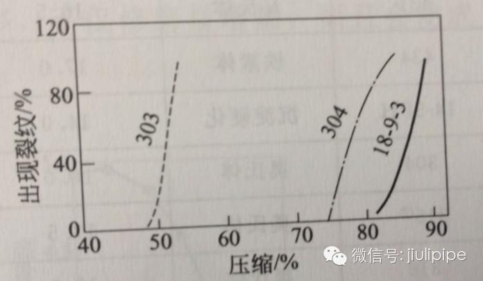 图6.0Cr18Ni9S(303)、0Cr18Ni9(304)和0Cr18Ni9Cu3(18-9-3)钢的冷加工开裂倾向